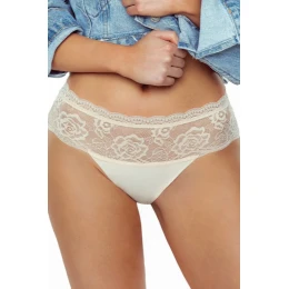 Mäkká a jemná čipka s kvetinovým motívom dodáva modelu eleganciu a štýl. Nohavičky zdobia krajkové detaily pozdĺž zadku av páse. Bavlna v prednej časti modelu je strihaná laserom. Bavlnená vložka (100%) zvyšuje pocit pohodlia a komfortu pri nosení. Model si zamilujú ženy, ktoré dokážu oceniť pohodlie a eleganciu. Nohavičky sú balené po jednom kuse v elegantnej krabičke so saténovou stužkou.