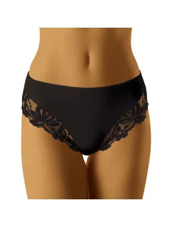 Pohodlné nohavičky s klasickou líniou a mierne vyšším pásom. Hladké, zdobené krásnou čipkou, ktorá zdobí stehná, a drobnou mašličkou uprostred. Materiál: mäkké, elastické mikrovlákno - 83 % polyamid, 17 % elastan.