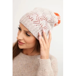 Dámská zimní čepice s příměsí vlny je ideální volbou pro ženy, které si cení jak stylu, tak funkčnosti. Model přitahuje pozornost originálním pletením s dekorativním vzorem a velkým, dvoubarevným pomponem, který jí dodává veselý, zimní charakter. Kontrastní akcent na zakončení čepice podtrhuje její nevšední design.