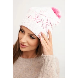 Dámská zimní čepice s příměsí vlny je ideální volbou pro ženy, které si cení jak stylu, tak funkčnosti. Model přitahuje pozornost originálním pletením s dekorativním vzorem a velkým, dvoubarevným pomponem, který jí dodává veselý, zimní charakter. Kontrastní akcent na zakončení čepice podtrhuje její nevšední design.