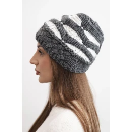 Dámská zimní čepice s příměsí vlny je teplou a stylovou nabídkou na mrazivé dny. Vyrobena z hrubé pleteniny s dekorativním vzorem, přitahuje pozornost nevšedním designem a horizontálními pruhy, které dodávají charakter celé stylizaci. Model se dokonale přizpůsobí hlavě, zajišťující teplo a pohodlí nošení po celý den.