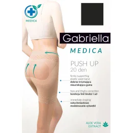 Wyrób pończoszniczy marki Gabriella. Model Medica Push-up 20 Den Code 127. Produkt został wykonany z 85% poliamid, 15% elastan. Odzież korygująca. Bielizna wyszczuplająca. Grubość: 20 DEN. Produkt damski.