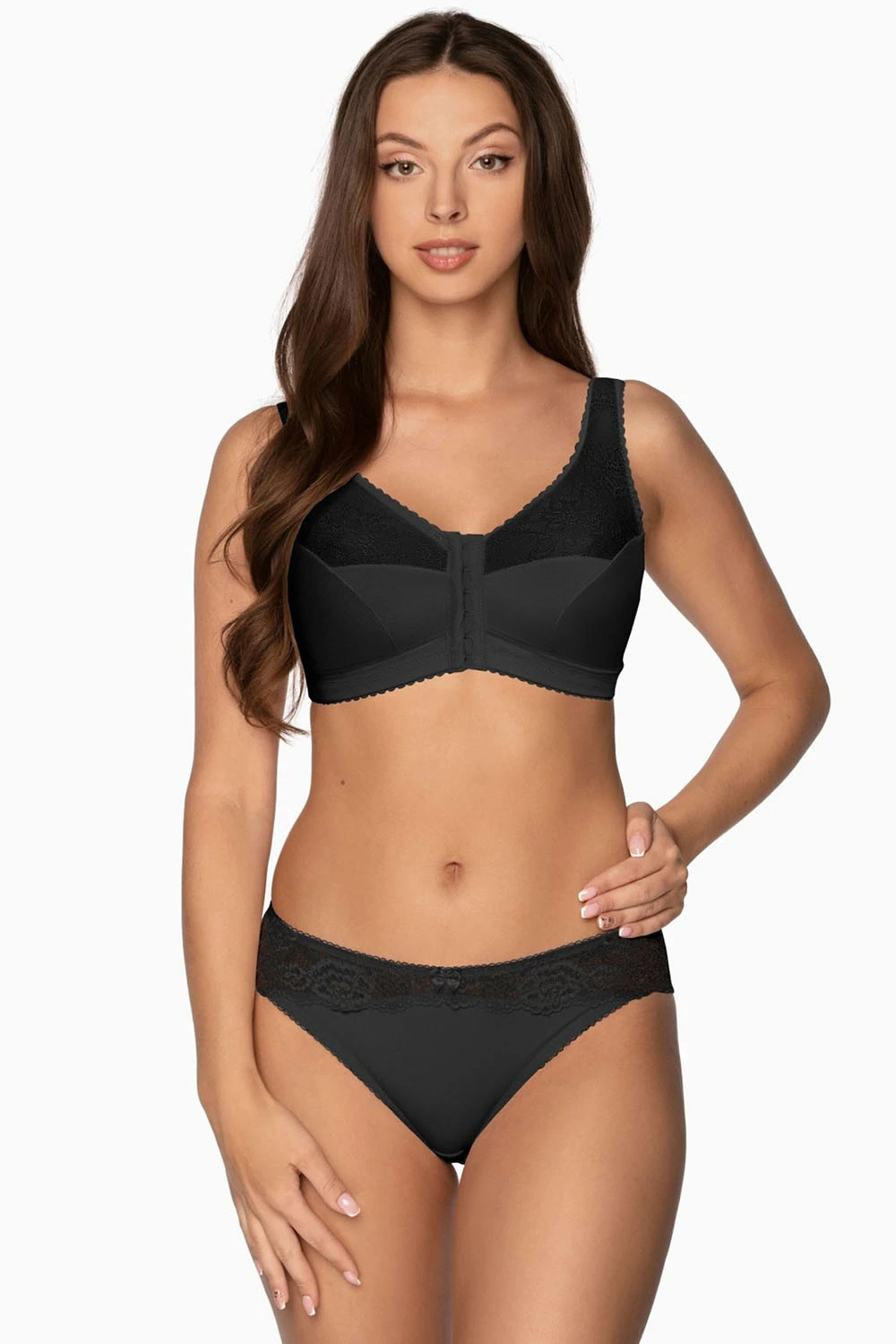 Podprsenka Gaia. Model 1163 Rachela. Výrobok má nastaviteľné popruhy bez možnosti odopnutia. Kovové háčiky na popruh. Podprsenka so zapínaním na háčiky a oči. Zapínanie: vpredu. Výrobok je vyrobený z 85% z polyamidu a 15% z elastanu. Výrobok pre ženy.parametre