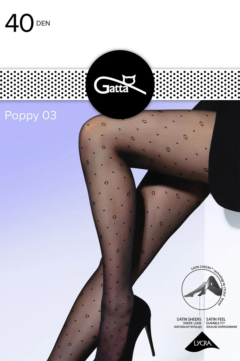 Gatta pančuchové nohavice, model Poppy 03, vyrobené z 93% polyamidu, 7% elastanu, bez vyznačených prstov, hrúbka 40 DEN, bez vyznačených nohavíc.parametre