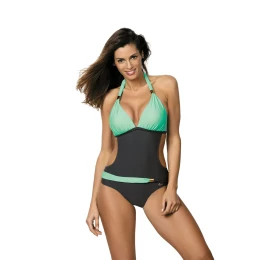 Horní díl plavek je spojen se spodním dílem širším, pěkně střiženým páskem, který maskuje bříško. Ze zadní strany vypadají plavky jako dvoudílné a vzadu se zapínají na přezku. Měkké pěnové vycpávky mají ve spodní části vyztužené košíčky, které prsa zvedají a opticky zvětšují. Podprsenky na bocích. Ramínka se zavazují za krkem a jsou zdobena stříbrnými brožemi. Na bocích pásek, rovněž s broží. Obě barvy (které k sobě dokonale ladí) zde vypadají svěže, moderně a svátečně. Ideální na pláž.