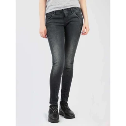 Dámske džínsy s nízkou výškou, zúženými nohavicami, zapínaním na zips a gombík, zadnými vreckami na zips a koženou nášivkou s logom na páse.