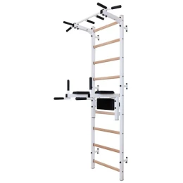 Drewniano – metalowa drabinka gimnastyczna z drążkiem i poręczą do ćwiczeń to solidna i praktyczna konstrukcja. Nie zajmuje dużo miejsca, jest przymocowana do ściany i odstaje na około 15 cm, dzięki czemu znakomicie sprawdzi się w każdym pomieszczeniu. Nowatorskie połączenie drewna z metalem idealnie komponuje się w aktualne trendy nowoczesnego wystroju wnętrza. Drabinka mocowana jest do ściany, z wykorzystaniem sześciu mocnych uchwytów. Profile boczne drabinki gimnastycznej zostały wykonane z metalu 40 x 50 mm o grubości stali – 2 mm. Metal wykorzystany w produkcji jest wysokiej jakości, a proszkowe malowanie zabezpiecza profile drabinki przed odpryskami, zarysowaniami czy zadrapaniami wynikłymi z użytkowania drabinki i kontaktu z osprzętem. Amortyzacja w kształcie litery T uchwytów do ściany skierowana jest na duże obciążenia, nawet do 150 kg osoby ćwiczącej na drabince gimnastycznej. Szczebelki wykonane są z drewna bukowego, są one ręcznie olejowane co zapobiegaś