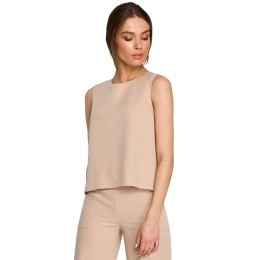 Krátka blúzka bez rukávov v trapézovom strihu s jemným výstrihom na chrbte. Určená pre milovníčky klasickej elegancie a náročnejšie módne návrhárky. Blúzka sa zapína na krytý zips.