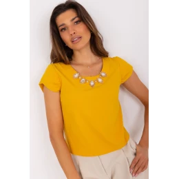Blúzka s krátkymi rukávmi v tvare bufetu a okrúhlym výstrihom. Na prednej strane zdobená šperkami.