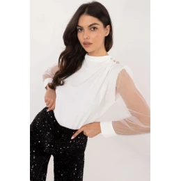 Elegantná blúzka s jemným ženským štýlom, ideálna na slávnostné príležitosti a do práce. Je vyrobená z hladkej tkaniny z polyesteru a elastanu, ktorá poskytuje pohodlie a jemne sa prispôsobí postave. Blúzka má okrúhly výstrih a dlhé rukávy zo sieťoviny, ktoré jej dodávajú ľahkosť a eleganciu. Priliehavé rukávy s ozdobnými záhybmi na ramenách a jemné gombíky dodávajú celku osobitý charakter. Štandardná dĺžka umožňuje blúzku dokonale kombinovať so sukňami aj nohavicami a vytvárať elegantné štýly.