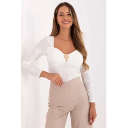 Elegantná blúzka štandardnej dĺžky, vyrobená z prevažne zmesi viskózy a polyesteru, ktorá spája pohodlie pri nosení s nenápadnou eleganciou. Model má hladký povrch a ženský výstrih v tvare srdca, ktorý je zdobený kovovým prvkom a jemnými záhybmi, ktoré celku dodávajú jedinečný charakter. Vložené vystužené košíčky zabezpečujú ideálne prispôsobenie a podporu poprsia, vďaka čomu blúzka vyzerá veľmi elegantne aj bez ďalších prvkov spodnej bielizne. Dlhé rukávy zdôrazňujú formálny štýl a vďaka absencii zapínania je model pohodlný a praktický. Skvelý návrh na spoločenské udalosti, obchodné stretnutia alebo elegantné výlety.