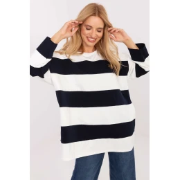 Blúzka nadrozmernej veľkosti s ležérnym charakterom, ideálna na každodennú štylizáciu. Je vyrobená z prevažujúcej zmesi bavlny a elastanu, čo poskytuje pohodlie pri nosení a voľnosť pohybu. Model dlhšieho strihu je ideálny k legínam alebo úzkym nohaviciam. Blúzka má dlhé rukávy a klasický okrúhly výstrih a jej dominantným vzorom sú nadčasové prúžky, ktoré celku dodávajú ľahkosť a sviežosť. Absencia zapínania zdôrazňuje uvoľnený, pohodlný strih, ktorý sa hodí ku každodennému, ležérnemu štýlu.