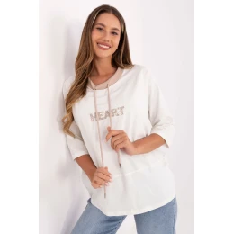 Táto dámska blúzka voľného strihu s vyšívaným motívom na prednej strane a šnúrkami vo výstrihu je štýlovým návrhom na každodenné príležitosti. Je vyrobená z mäkkej bavlny s prídavkom elastanu a poskytuje pohodlie a voľnosť pohybu počas celého dňa. Model so štandardnou dĺžkou, 3/4 rukávmi a klasickým okrúhlym výstrihom spája jednoduchosť s módnymi detailmi, takže je ideálny na každodenný ležérny štýl, či už s nohavicami alebo sukňou.
