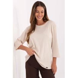 Tento ležérny dámsky top s hladkým vzorom je všestrannou voľbou na každodenné štylizácie. Je vyrobený z príjemného materiálu a poskytuje pohodlie počas celého dňa. Model so štandardnou dĺžkou, 3/4 rukávmi a klasickým okrúhlym výstrihom spája jednoduchosť s pohodlím, takže je ideálny na každodenné outfity s nohavicami aj sukňami.
