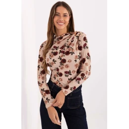 Táto elegantná dámska blúzka so strihom na mieru je ideálnou voľbou do práce, na stretnutia aj na každodenné nosenie. Je vyrobená z príjemnej zmesi viskózy a polyesteru a spája v sebe pohodlie s odolnosťou. Kvetinový vzor jej dodáva ženský charakter, zatiaľ čo štandardná dĺžka a dlhé rukávy ju robia elegantnou a nadčasovou. Plynulý výstrih sa krásne skladá na postave a jemné záhyby na ľavom ramene, zdobené kovovou sponou, sú výnimočným akcentom, ktorý podčiarkuje elegantný štýl blúzky. Model bez zapínania zaručuje pohodlie a voľnosť pri nosení.