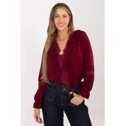 Elegantní dámská halenka je stylovým návrhem, který se skvěle hodí jak na formální události, tak do práce nebo na každodenní nošení. Její klasický tvar byl obohacen o dekorativní detaily, díky nimž působí mimořádně žensky a elegantně. Model vyrobený ze směsi viskózy, polyesteru a elastanu zaručuje pohodlí nošení, elasticitu a krásné přizpůsobení se postavě. Hladký dominantní vzor činí halenku univerzální a skvěle ladí jak s elegantní dolní částí, tak s každodenními kousky oblečení. Halenka má standardní délku a dlouhý rukáv zakončený decentní volánkou, která celku dodává jemný, ženský charakter. Výstřih do V opticky zjemňuje krk a absence tradičního zapínání zaručuje výjimečnou pohodlí. K halence dodávají zvláštní kouzlo krajkové vložky vpředu a na rukávech, tvořící elegantní a romantický akcent. Navíc model vyniká dekorativními volány a efektní broží, které zdůrazňují formální, stylový charakter h