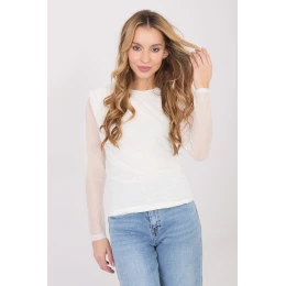Elegantná blúzka z jemnej sieťoviny s prispôsobeným strihom, ktorá jemne zvýrazňuje postavu a dodáva stylingu rafinovaný charakter. Je vyrobená z kombinácie polyesteru a elastanu, čo zabezpečuje pohodlie a pružnosť materiálu. Model s jednoduchým vzorom má klasický okrúhly výstrih a dlhé rukávy, ktoré zostávajú bez podšívky, čo vytvára ľahký a zmyselný efekt. Blúzka je na tele podšitá, čo zabezpečuje pohodlie a estetické zakončenie. Ozdobné nariasenie dodáva eleganciu a jemne tvaruje postavu. Štandardná dĺžka zaručuje, že blúzka je ideálna do práce, na spoločenský styling, ako aj na elegantné vychádzky alebo večierky.
