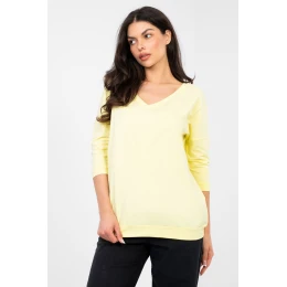 Halenní blůza s nadčasovým hladkým vzorem je ideální základ pro mnoho stylizací. Vyrobená z vysoce kvalitní bavlny s přídavkem elastanu poskytuje pohodlí nošení, prodyšnost a jemné přizpůsobení se postavě. Materiál je měkký a elastický, díky čemuž se skvěle hodí po celý den. Model se standardní délkou a 3/4 rukávem je praktickým a univerzálním řešením na každou roční dobu. Klasický výstřih do V jemně podtrhuje linii krku a dodává ženský charakter. Výjimečným prvkem je výstřih do V na zádech, který blůze dodá lehkost a originalitu, zachovávající přitom její každodenní styl. Bez zapínání je blůza pohodlná a snadno se obléká. Je to skvělá volba jak k džínům, látkovým kalhotám, tak i sukním ideální na každý den, do práce nebo na neformální setkání.