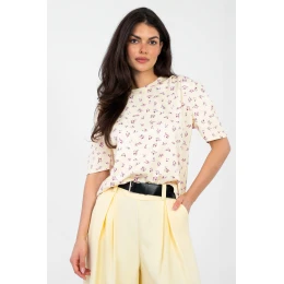 Táto elegantná blúzka na každý deň je dokonalou kombináciou pohodlia a ženského štýlu. Skvele sa hodí do práce aj na bežné nosenie, čím vytvára štýlový a upravený outfit. Model štandardnej dĺžky má klasický okrúhly výstrih a krátke rukávy, čo zaručuje pohodlie počas celého dňa. Kvetinová potlač dodáva celkovému vzhľadu jemný, svieži charakter a zdôrazňuje ženský štýl. Ozdobné riasenie dodáva blúzke eleganciu a jemne modeluje postavu. Blúzka je vyrobená z kombinácie polyesteru, viskózy a elastanu, vďaka čomu kombinuje odolnosť s jemnosťou a pružnosťou materiálu, čo zaručuje pohodlie a voľnosť pohybu. Univerzálny dizajn sa hodí k elegantným nohaviciam, ako aj k sukni alebo klasickým džínsom.