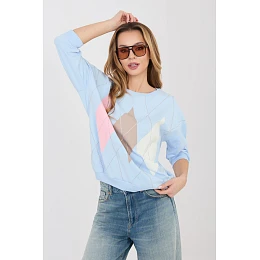 Pohodlný dámsky sveter v každodennom štýle, ktorý je ideálny na bežné nosenie. Model v štandardnej dĺžke má klasický okrúhly výstrih a praktické 3/4 rukávy, ktoré zaručujú pohodlie a budú vhodné na nosenie v každom ročnom období. Geometrický vzor na prednej strane je dominantným ozdobným prvkom a dodáva svetru moderný charakter. Jednoduchý strih zaručuje, že model sa ľahko nosí a ľahko sa kombinuje s mnohými outfitmi. Sveter je vyrobený z kvalitnej bavlny s prídavkom elastanu, vďaka čomu je materiál mäkký, príjemný na pokožku a mierne elastický. Model nemá zapínanie, čo zdôrazňuje jeho pohodlný, každodenný charakter.