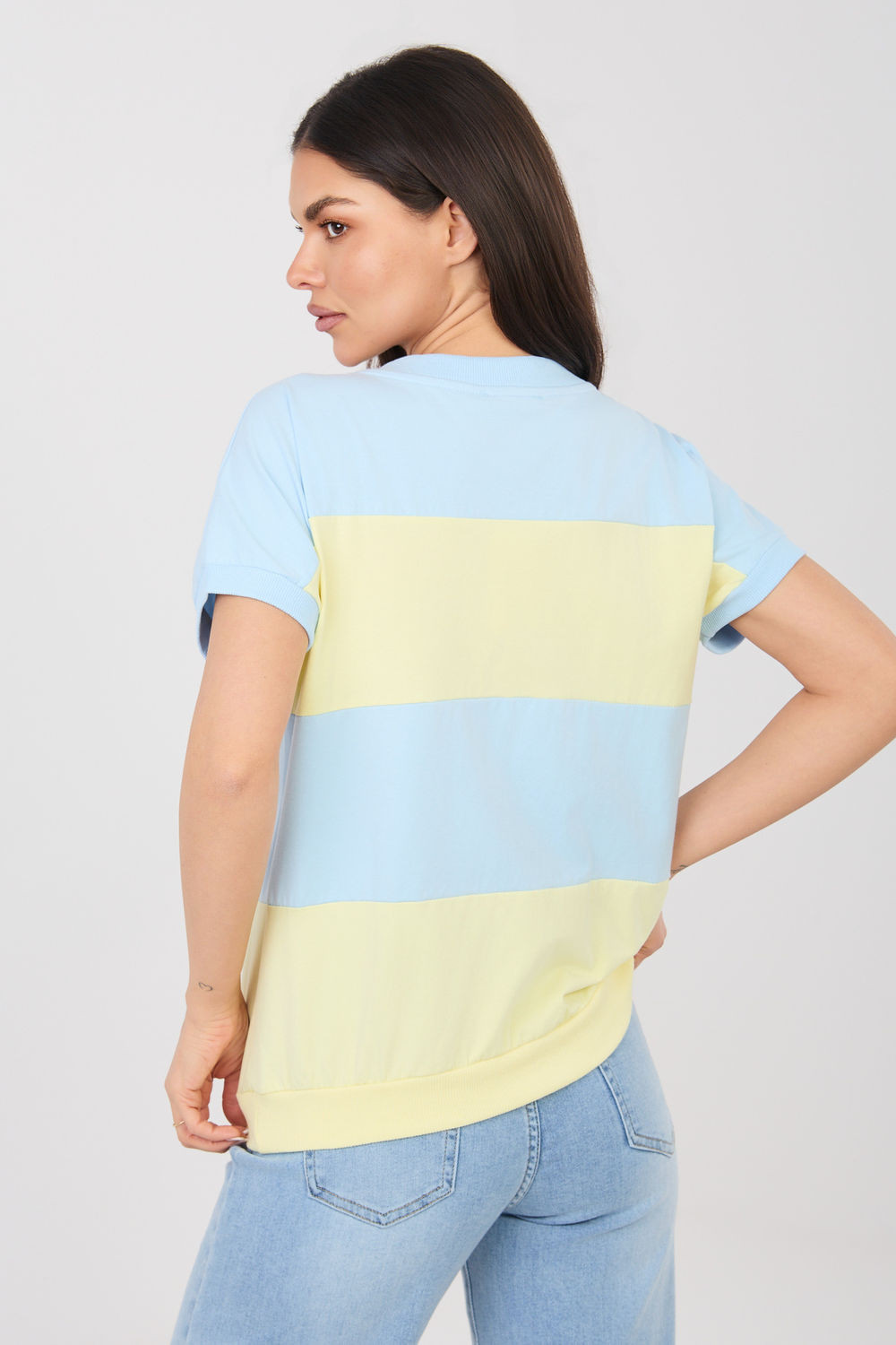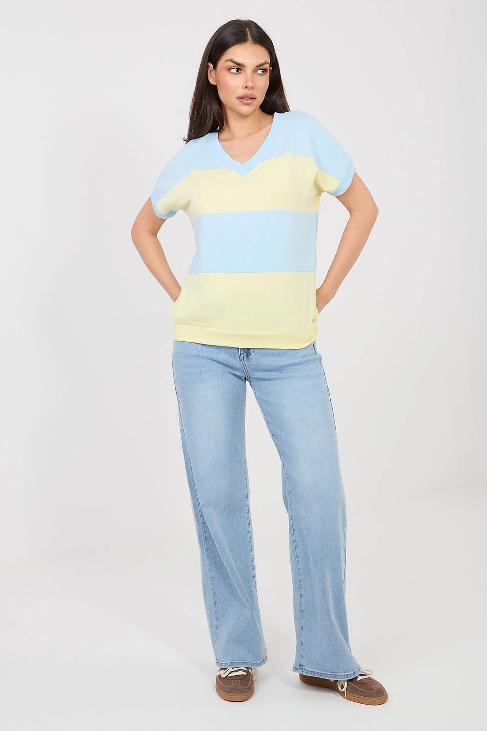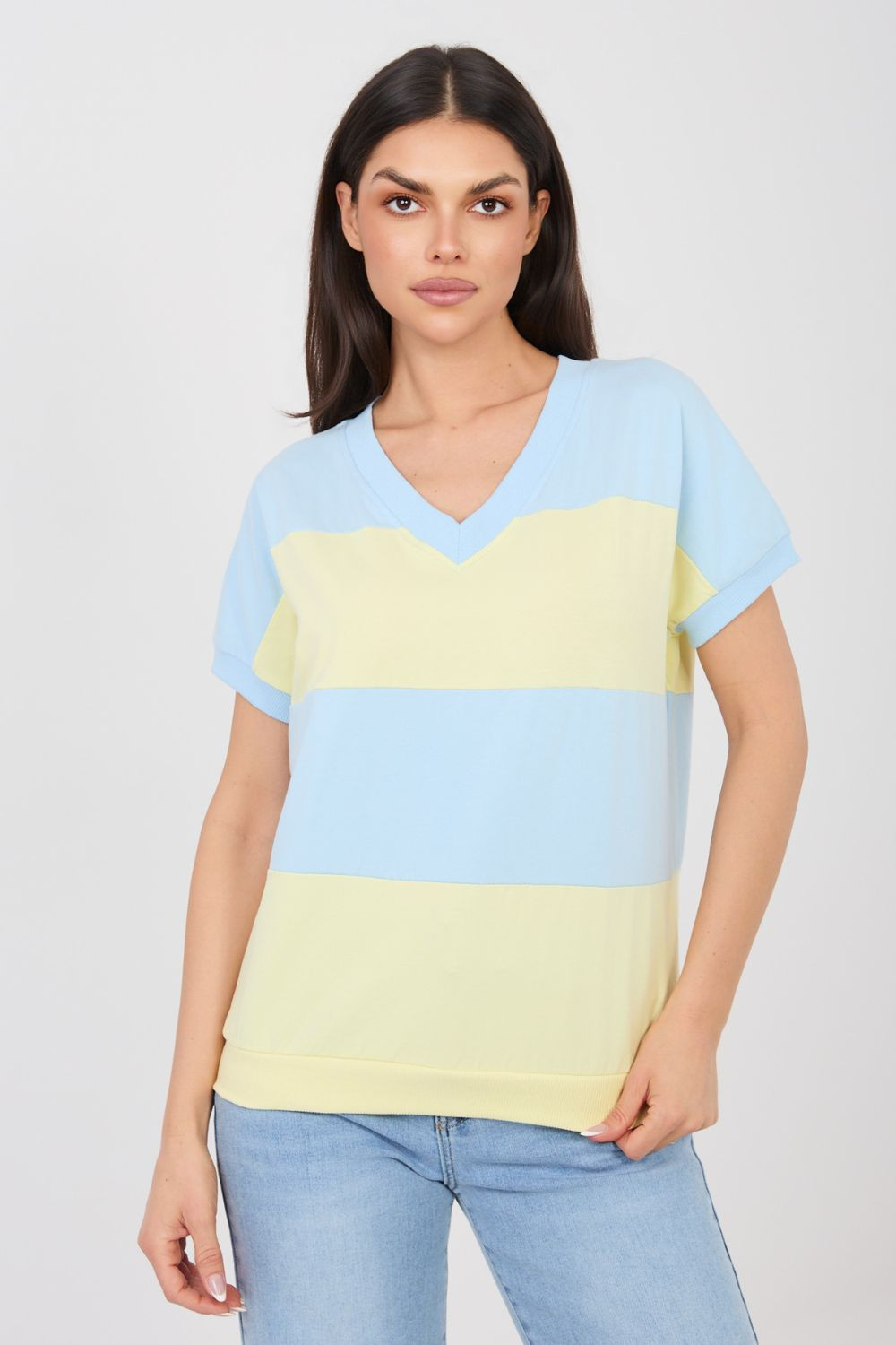Elegantný dámsky top v ležérnom dizajne, ideálny na každý deň. Model v štandardnej dĺžke má krátke rukávy a ženský výstrih do V, ktorý jemne zvýrazňuje dekolt a dodáva celému outfitu ľahkosť. Dominantným dizajnovým prvkom sú široké pruhy, ktoré dodávajú topu moderný a nadčasový charakter. Jednoduchý, pohodlný strih zaručuje, že sa model dobre prispôsobí postave a poskytuje voľnosť pohybu počas každodenného nosenia. Top je vyrobený z kvalitnej bavlny s prídavkom elastanu, vďaka čomu je materiál mäkký, príjemný na pokožku a mierne elastický. Model bez zapínania zdôrazňuje jeho pohodlný, každodenný charakter a dokonale sa hodí k mnohým ležérnym outfitom.