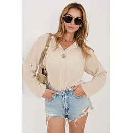 Blúzková košeľa vyrobená z kvalitnej bavlny, ktorá poskytuje pohodlie a priedušnosť počas celého dňa. Vďaka hladkému vzoru je košeľa univerzálna a ľahko kombinovateľná s mnohými štýlmi, džínsami aj sukňami. Košeľa má výstrih do V zdobený jemným gombíkom, ktorý jej dodáva jemný, ženský charakter. Štandardná dĺžka zaručuje dobré prispôsobenie sa postave a umožňuje nosiť ju rôznymi spôsobmi. Model má dlhé rukávy s možnosťou skrátenia, vďaka čomu sa košeľa ľahko prispôsobí počasiu a štýlu. Bez zapínania je pohodlná a rýchlo sa oblieka, ideálna na každodenné príležitosti. 100 %bavlna