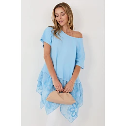 Výjimečná dámská blůza v boho stylu, která spojuje pohodlí s jemnou ženskou elegancí. Model s delším střihem má klasický kulatý výstřih a krátký rukáv, díky čemuž poskytuje pohodlí při nošení a volnost pohybu. Blůza je v hladkém vzoru, co podtrhuje její minimalistický a stylový charakter. Vyrobená z přírodní bavlny je měkká, prodyšná a příjemná na kůži, díky čemuž se skvěle hodí na teplejší dny. Zvláštním ozdobným prvkem modelu je přišitá asymetrická vyšívaná volánka na spodku, která dodává celku lehkost a zdůrazňuje boho charakter blůzy. Ideální volba pro každodenní outfit, skvěle se kombinuje jak s džíny, tak s legínami nebo přiléhavými kalhotami. Volánka: 85% viskóza, 15% nylon. materiál: 100%bavlna