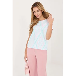 Tento dámsky top na každodenné nosenie je pohodlným a štýlovým návrhom na rôzne príležitosti. Je vyrobený z príjemnej zmesi bavlny a elastanu, poskytuje pohodlie pri nosení, dobrú priedušnosť a ľahkú elasticitu, vďaka ktorej sa prispôsobí postave. Model zdobí geometrický vzor, ktorý mu dodáva moderný a osobitý charakter. Vďaka štandardnej dĺžke je top skvelým doplnkom ku nohaviciam aj sukniam. Krátke rukávy a okrúhly výstrih jemne zvýrazňujú ženskú siluetu a dodávajú celému outfitu ľahkosť. Konštrukcia bez gombíkov zvyšuje pohodlie pri nosení a umožňuje model ľahko obliecť. Univerzálny top ideálny na každý deň, skvelý do práce aj na menej formálne udalosti.