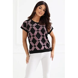 Tento dámsky top na každodenné nosenie má pohodlný a štýlový dizajn na rôzne príležitosti. Je vyrobený z príjemnej zmesi bavlny a elastanu, poskytuje pohodlie pri nosení, dobrú priedušnosť a ľahkú elasticitu, vďaka ktorej sa prispôsobí postave. Model zdobí geometrický vzor, ktorý mu dodáva moderný a osobitý charakter. Štandardná dĺžka umožňuje top dokonale kombinovať s nohavicami aj sukňami. Krátke rukávy a okrúhly výstrih jemne zvýrazňujú ženskú siluetu a dodávajú celému outfitu ľahkosť. Konštrukcia bez gombíkov zvyšuje pohodlie pri nosení a umožňuje model ľahko obliecť. Univerzálny top je ideálny na každý deň, výborne sa hodí do práce aj na menej formálne udalosti.