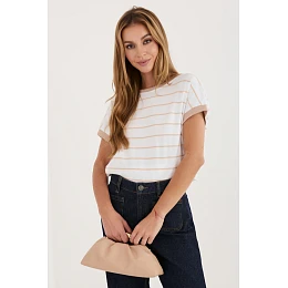 Halenní tričko je stylový a pohodlný návrh vhodný jak na každý den, tak i do práce. Vyrobené z vysoké kvality směsi bavlny a elastanu, zaručuje pohodlí nošení, prodyšnost a lehkou pružnost, díky čemuž se dobře přizpůsobuje postavě. Model zdobí nadčasový pruhovaný vzor, který dodává celku klasický, ale zároveň moderní vzhled. Standardní délka dělá tričko skvěle sladitelným s různými kousky oblečení, od kalhot po sukně. Krátký rukáv a okrouhlý výstřih vpředu zdůrazňují jeho univerzální charakter. Zadní strana přitahuje pozornost díky efektnímu výstřihu ve tvaru písmene V a ozdobné mašli, které dodávají celku ženský půvab a originalitu. Bez zapínání je tričko pohodlné a snadno se obléká. To je skvělá volba pro ženy, které ocení spojení klasiky s jemnými dekorativními detaily.