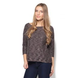 Blúzka z melanžovej tkaniny s 3/4 rukávmi. Voľný strih s oválnym výstrihom spadajúcim na ramená. Veľmi rovná línia s výrazne dlhším chrbtom dodáva voľný a módny charakter. Zadný diel blúzky zdobí nápadný panel z módnej priehľadnej látky.