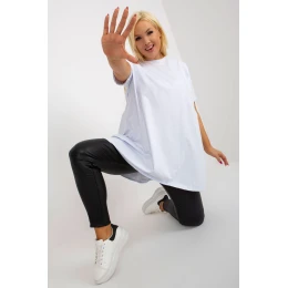 Predĺžený top v ležérnom štýle, ideálny na každodenné príležitosti. Je vyrobený z príjemnej bavlny s prídavkom elastanu, vďaka čomu je mäkký, elastický a pohodlný na celodenné nosenie. Hladký vzor zaručuje, že top sa ľahko kombinuje s mnohými štýlmi. Model má okrúhly výstrih a krátke rukávy, čo mu dodáva univerzálny, uvoľnený charakter. Absencia zapínania zvýrazňuje jednoduchý, pohodlný strih. Ďalšou výhodou je volánik na chrbte, ktorý jemne oživuje strih a dodáva mu ženský šarm. Ideálna voľba na každý deň k džínsom, legínam alebo sukni.