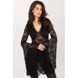 Elegantní krajková blůza s stylovým a ženským charakterem, ideální na každodenní nošení, společenské události a večírky. Model upoutává pozornost různorodou texturou materiálu, která dodává celku jedinečný, jemný šarm. Blůza je vyrobena z kombinace polyamidu a elastanu, co zajišťuje pružnost, přizpůsobení se postavě a pohodlí při nošení. Krátká délka ve spojení s dlouhým, od lokte rozšířeným rukávem tvoří efektní, moderní střih. Výstřih do V jemně zdůrazňuje linii krku a poprsí, dodávajíc eleganci a lehkost. Model nemá zapínání a obléká se přes hlavu. Kromě toho má blůza podšívku na přední straně v oblasti prsou, co zajišťuje pohodlí a estetické dokončení. Jedná se o ideální volbu pro ženy, které chtějí spojit eleganci s efektním, moderním designem.