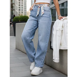 Jeansy damskie o luźnym kroju łączą wygodę noszenia z modnym, swobodnym stylem. Wysoki stan dobrze układa się w talii i wpływa na proporcje sylwetki. Bawełniany materiał z dodatkiem elastanu zapewnia komfort w codziennym użytkowaniu. Ozdobna apaszka w pasie stanowi stylowe uzupełnienie fasonu.