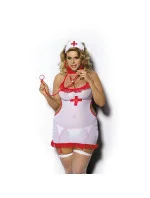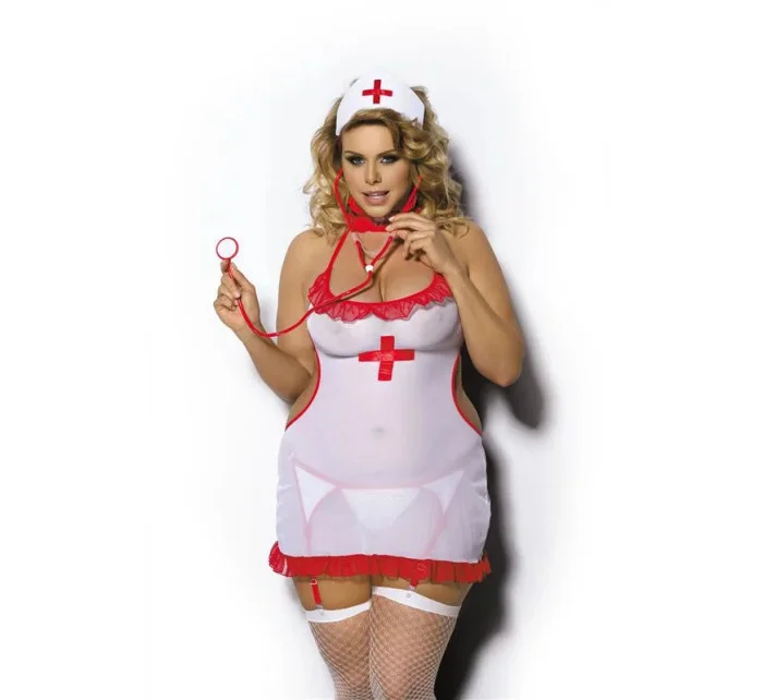 Úplne skvelý komplet Shane z najnovšej kolekcie Gorgeous +, ktorý je určený ženám, ktorí nosili veľkosť plus size. Podmanivý kostým zvodné zdravotnej sestričky na mieste postaví späť na nohy nejedného pacienta, ktorý sa nachádza v domácom ošetrení. Snehovo biela priehľadná košieľka s charakteristickým strihom, hlboký výstrih skrášlený výrazným emblémom zdravotnej služby, čarovným volánikom a praktickú reguláciou na šiji, ktorá zaisťuje ideálne prispôsobenie a vkusné zdôraznenie pŕs. V kompletu: košieľka, tangá s pasom do pančúch, čiapky. Pančuchy a stetoskop nie je súčasťou balenia.
