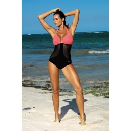 Senzačné jednodielne plavky s tylovými bokmi. V tejto sezóne veľmi módne. Mierne zakrýva bruško, ale napriek tomu vám umožní vyzerať výnimočne krásne. Konštrukcia hornej časti (košíčkov) bola profesionálne vymodelovaná - z malých a stredných pŕs vytvára niečo naozaj výnimočné. Košíčky sú vystužené špeciálnou penou a majú zabudovaný push-up, ktorý prsia nadvihne, priblíži ich k dekoltu a zvodne ich zväčší. Push up nemožno z modelu vybrať. Ramienka sa zaväzujú na krku a sú zdobené elegantnou brošňou. Obvod je elastický, na chrbte sa pohodlne zapína prackou. Tu sú veľmi módne, moderné jednodielne plavky push up monokiny. Rozhodne odporúčame!