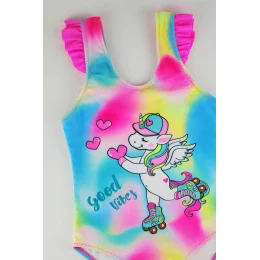 Dívčí jednodílné plavky, barevné, stínované, zdobené vzorem jednorožce na přední straně. Ramínka zdobená volánkem, rychleschnoucí tkanina.