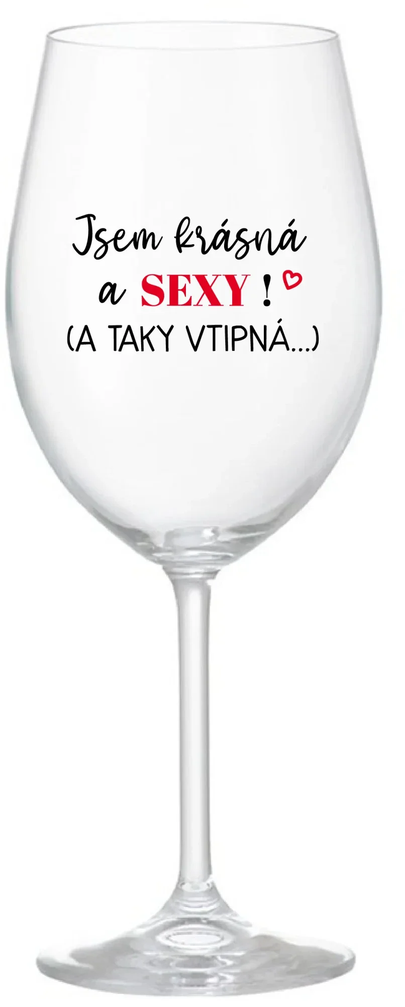 Vinná čirá sklenice s originálním motivem JSEM KRÁSNÁ A SEXY! (A TAKY VTIPNÁ...) je krásným a osobitým dárkem, které ale využijete i Vy sami třeba ve chvílích, kdy si budete chtít zpříjemnit náročný den. Tyto originální vinné sklenice jsou totiž nejen pro výjimečné události, ale i pro běžné večery, které si chcete zpříjemnit sklenkou dobrého vína. Jistě proto potěší každého milovníka vína, i toho, kdo si umí svůj život vychutnat plnými doušky.parametre
