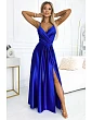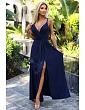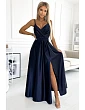 Brokátové dlhé šaty s výstrihom - tmavomodré