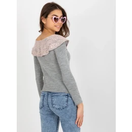 Szaro-jasnoróżowa bluzka z koronkowym wykończeniem.