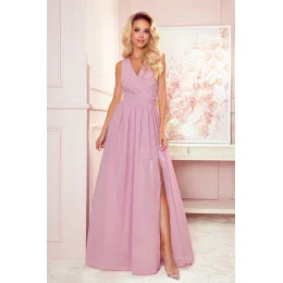JUSTINE - Dlhé dámske šaty v púdrovo ružovej farbe s výstrihom a zaväzovaním 362-3