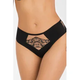 Predná časť: z nepriehľadného mikrovlákna, vyšívaná vsadka podšitá stabilným tylom, nohavičky zakončené úzkou gumou.