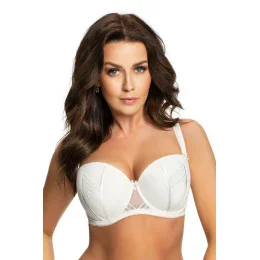Elegancki biustonosz usztywniany typu balkonetka w kolorze delikatnego kremu. Miseczki, usztywniane mięciutką pianką, składają się z trzech części połączonych dwoma pionowymi szwami, zamaskowanymi satynowymi lamówkami. Środkowe części miseczek oraz środek biustonosza ozdobiony jest pokryte są piękną koronką elastyczną, imitującą paskową aplikację Kształt miseczek sprawia, że dekolt jest wyeksponowany, a piersi idealnie podtrzymane, przybierają pełny, zaokrąglony kształt. Górna linia misek wykończona jest ozdobną, wąziutką satynową taśmą. Od wewnątrz w miseczkach kieszonka do wkładek push- up. Między miseczkami urocza kokardka. Boczki wykonane zostały z mocnej, odpornej na rozciąganie dzianiny typu lycra, wzmocnione – we wszystkich rozmiarach - bocznymi, pionowymi fiszbinami.