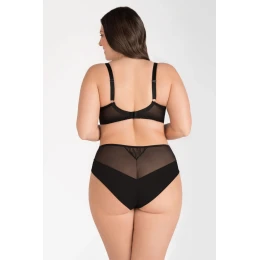 PRZÓD: koronka stabilna podszyta tiulem stabilnym, ozdobne paski z taśmy elastycznej z regulatorami, boki u góry z pojedynczego tiulu elastycznego, na dole tiul elastyczny w złożeniu na gładko, fragment nogawki wykończony wąską taśmą elastyczną.