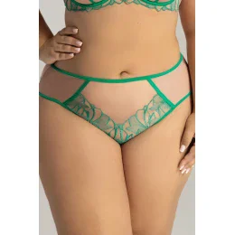 Zvýraznite svoju ženskosť týmito jedinečnými nohavičkami telovej farby, ktoré sú oživené jemnou, ale odvážnou výšivkou v zvodnom zelenom odtieni. Jemná tylová predná časť je na pokožke ľahká a zmyselná, zatiaľ čo zelené lemovanie a motív kvetinovej výšivky dodávajú celému vzhľadu moderný a svieži nádych.