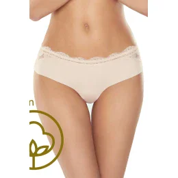 Dámske nohavičky, predná časť je vyrobená z hladkej bavlny, nohavičky sú rezané laserom. Zadný diel z čipky s kvetinovým motívom na pozadí z jemnej, zmyselnej sieťoviny, vnútorný pásik s jemnou gumičkou na podporu. V rozkroku je vložka zo 100% bavlny. Zmyselný strih dokonale zvýrazňuje tvar zadku.