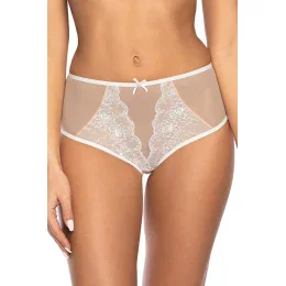 Dámske nohavičky s vysokým strihom, vyrobené zo sieťoviny v béžovej farbe. Predná strana zdobená výšivkou.