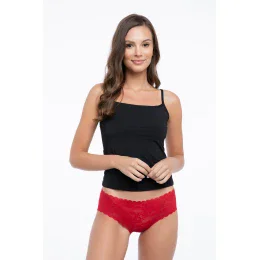 Elegantné krajkové nohavičky pre ženy. Pevné klasické nohavičky v červenej farbe, ktoré lákajú na pohľad kvetinovým vzorom z elastickej čipky a motýlikovým okrajom. Kvalitná čipka použitá na nohavičkách je hustá a dobre kryje. Vďaka technológii JULIMEX Laser-cut nevyčnievajú žiadne nitky. V páse ani vo výrezoch na stehnách nie sú žiadne švy, takže nohavičky zostávajú neviditeľné pod priliehavým oblečením. Nohavičky majú v rozkroku všitú bavlnenú hygienickú vložku.