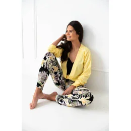 Krásny jednofarebný kardigán s dvoma gombíkmi a krátkou dĺžkou na bokoch, ktorý možno použiť ako sveter a ako prikrývku k pyžamám Ana a Adelina značky Sensis. Pohodlné dlhé rukávy. Krásna slnečná farba. Zloženie: 50 % viskóza, 25 % polyester.