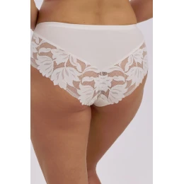 Figi koronkowe ecru z dodatkiem siatki w kolorze mokka to połączenie klasycznej elegancji i nowoczesnego stylu. Subtelna, kwiatowa koronka w odcieniu ecru pięknie komponuje się z delikatną siateczką w modnym kolorze mokka, tworząc niezwykle kobiecy efekt. Krój idealnie dopasowuje się do sylwetki, zapewniając komfort noszenia i podkreślając kobiece kształty. Tył z efektownej koronki dodaje lekkości i zmysłowości, a przód zdobi drobna kokardka, która podkreśla romantyczny charakter modelu. To idealny wybór zarówno na co dzień, jak i na wyjątkowe okazje.